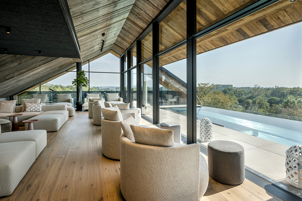 Das Mühlbach bietet ein vielfältiges Saunenspektrum inklusive Event-Saunen im Sky Spa, klassische Saunen, Dampfbäder sowie Ruhebereiche mit Panoramablick.