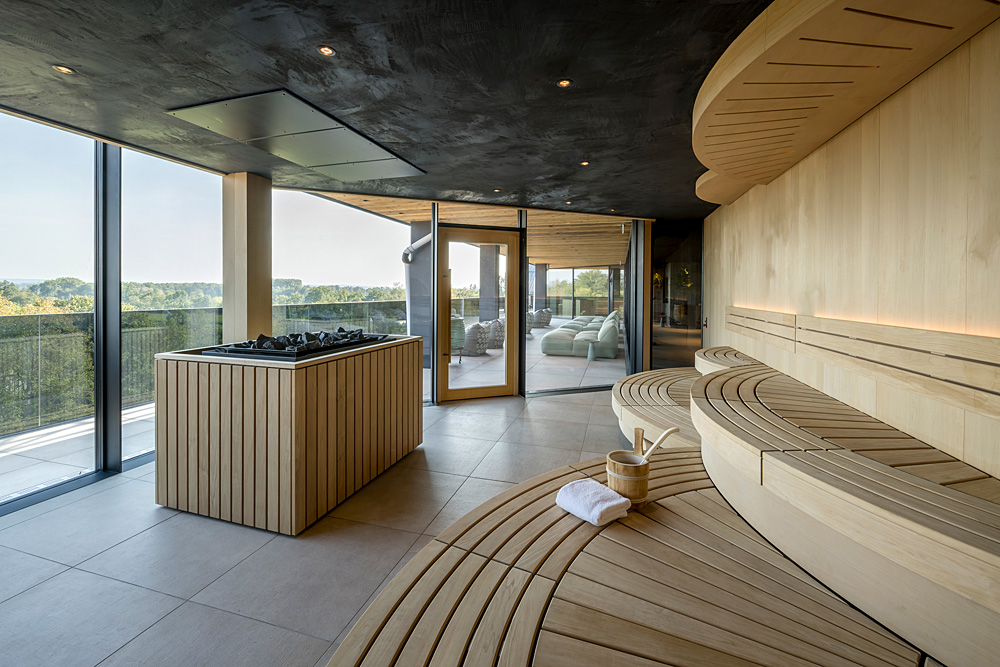 Der Thermal- und Spa-Bereich erstreckt sich über mehrere tausend Quadratmeter und umfasst unterschiedliche Erlebniszonen wie LandTherme, Sky Spa und verschiedene Saunen.